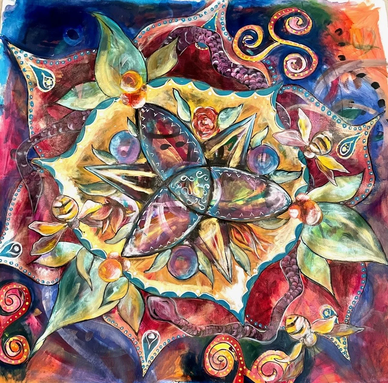 We will also be having a dialogue with our canvas: a conversation between layering color, words and images onto the canvas and listening, noticing what the canvas might reflect back: inner dialogue - perhaps an inner critic or an inner cheerleader. Being in the flow state (which is what happens when we paint) allows insights, realizations and awarenesses to arrive more freely. The canvas can also become like a mirror to us: reflecting back where we struggle, where we feel free.
